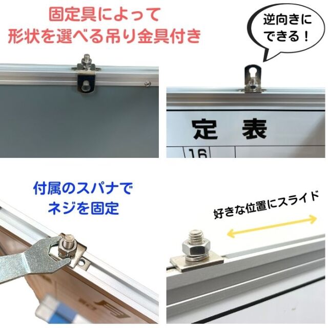 | 材質 | 本体:アルミ ボード面:スチールホワイトボード ボード裏面:スチールカラー鉄板 ボード芯材:プラスチックダンボール コーナーキャップ:ABS樹脂 |