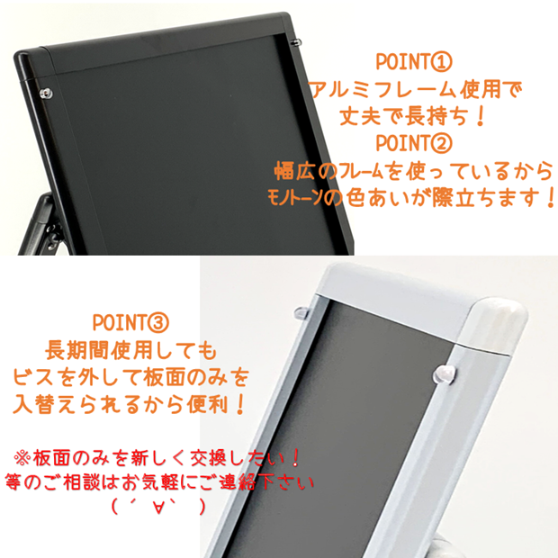 モノトーンのフレームとつや消しの板面で落ち着いた雰囲気のブラックボードです。