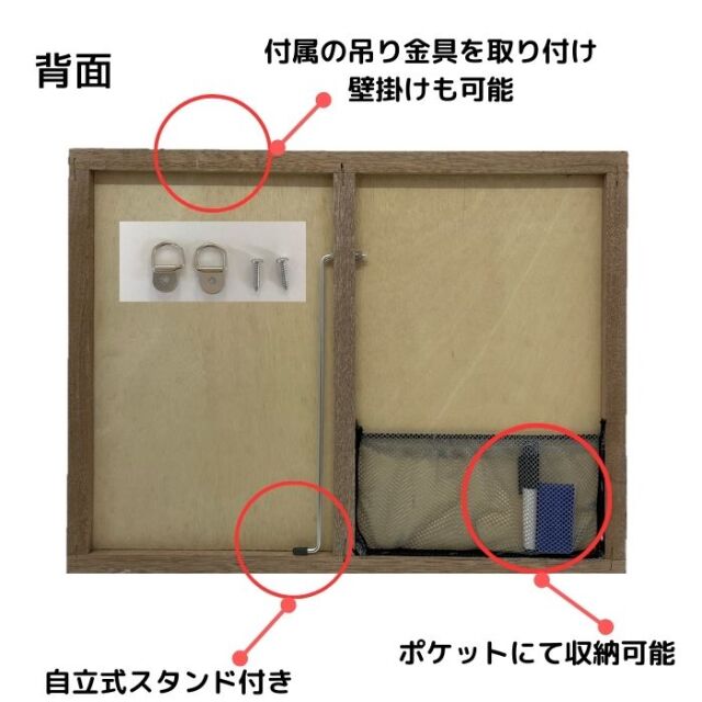 裏面にチョーク等を収納できるポケット付きで、付属品が迷子になりません。