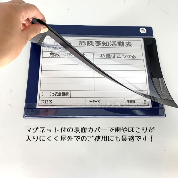 表面カバーがマグネット付きで雨から掲示物を守り用紙の出し入れが簡単です。軽量で持ち運びに便利です。