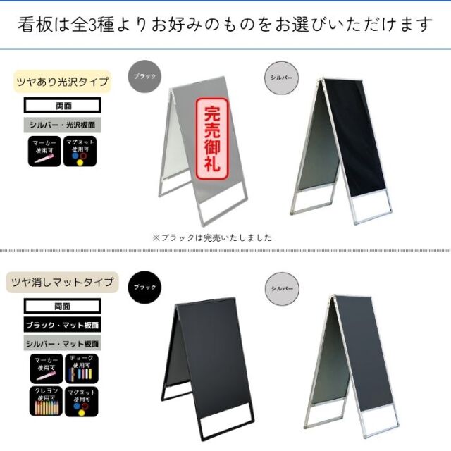 | カラー | 【看板本体】 ブラック (ツヤ消しマットボード面のみ) シルバー (ツヤあり光沢ボード面 / ツヤ消しマットボード面) 【バリウエイト】 シルバー 【ポスカ】 白・赤・桃・黄色・水色・緑・黄緑・橙 |