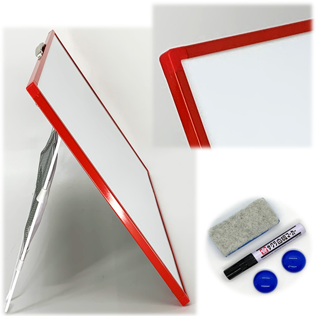 赤いアルミフレームの持ち運びできるホワイトボードです。